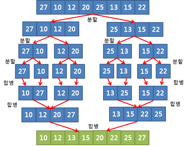 - 재귀를 이용하는 분할(배열을 쪼개는 것)정복(분할한 배열을 정렬하면서 하나로 합병하는 것) 알고리즘