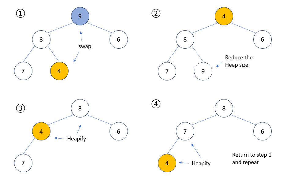 (2) 생성한 최대 힙에서 삭제 연산을 이용해 정렬 수행(루트 노드 제거-> 마지막 노드를 루트 노드로 -> 힙하게 만들기 -> 삭제연산 수행 반복)