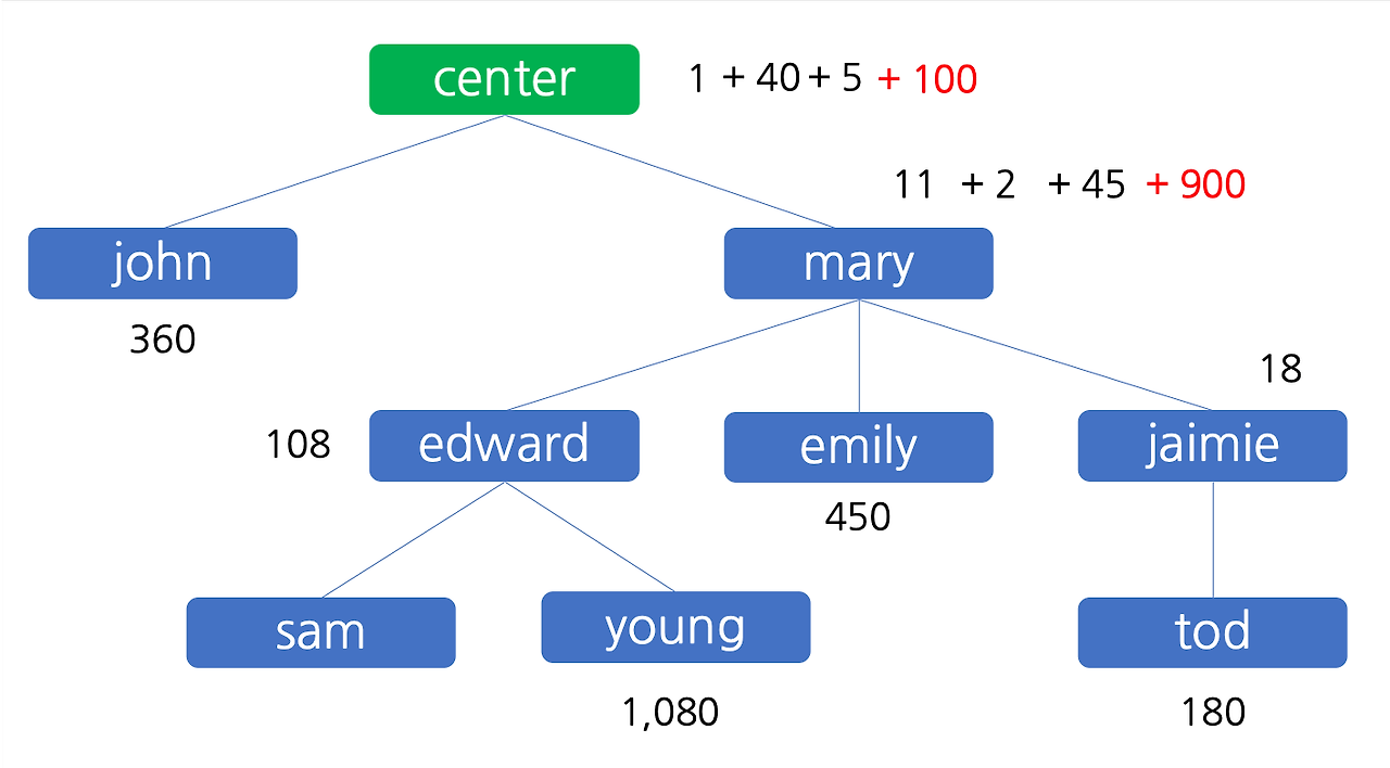 민호는 다단계 조직을 이용하여 칫솔을 판매하고 있습니다. 판매원이 칫솔을 판매하면 그 이익이 피라미드 조직을 타고 조금씩 분배되는 형태의 판매망입니다. 어느정도 판매가 이루어진 후, 조직을 운영하던 민호는 조직 내 누가 얼마만큼의 이득을 가져갔는지가 궁금해졌습니다. 예를 들어, 민호가 운영하고 있는 다단계 칫솔 판매 조직이 아래 그림과 같다고 합시다.