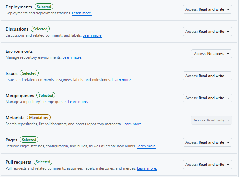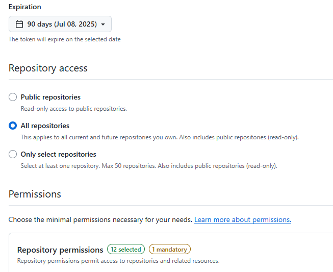토큰 이름, 유효기간, 적용 범위(레포지토리 지정 가능), 권한을 설정해준다.