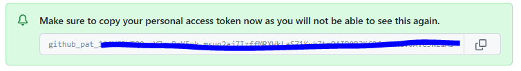 토큰을 만들면 바로 초록색 박스 안에 이렇게 뜨고, 바로 복사한 후 보관해야된다. (이 때 한번밖에 못 봄...)