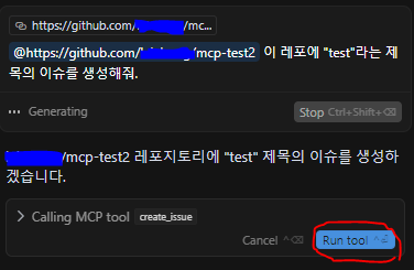 이런 식으로 agent에 링크와 함께 건네주면 MCP tool을 가져와서 내가 Run tool을 누를 때까지 기다린다.