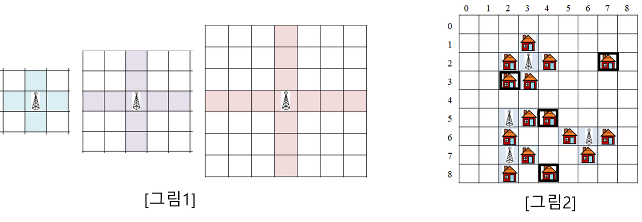 기지국은 [그림1]과 같이 세가지 종류가 있다. 각각의 기지국은 기지국이 위치한 셀에서 동서남북으로 각 1개, 2개, 3개의 셀을 커버하며, 하나의 집은 1개의 셀에 있다.